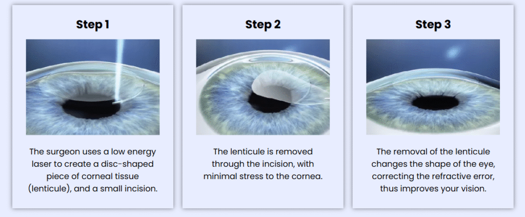 A high-precision femtosecond laser creates a small corneal incision and removes a tiny disc of tissue to reshape the cornea, correcting the refractive error and improving your vision.