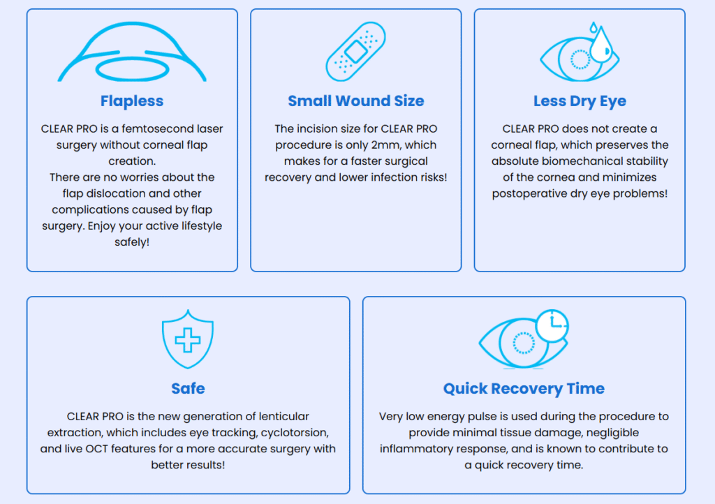Unlike LASIK, CLEAR PRO requires only a small incision and does not involve creating a corneal flap. This reduces the risks associated with flap dislocation, long-term healing issues, or flap-related complications.